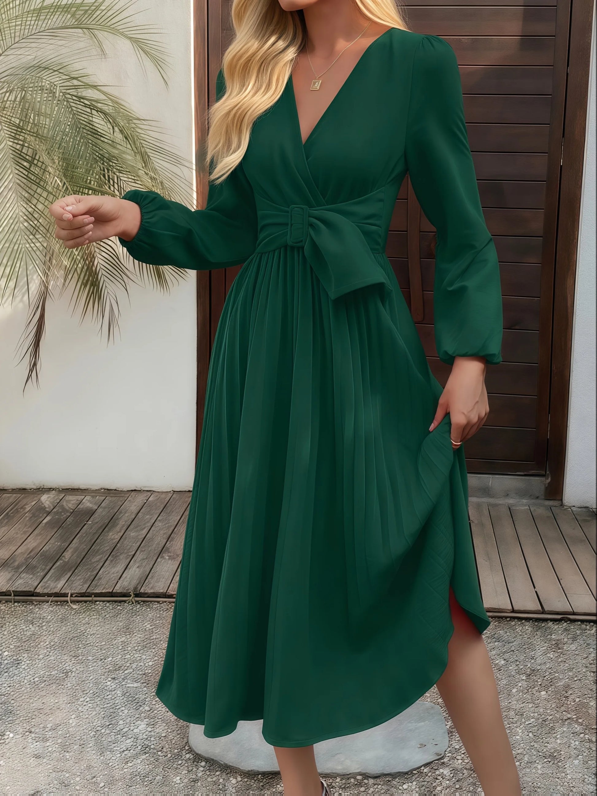 Green Chiffon V-Neck Pleated Dress – Elegant Party Fit