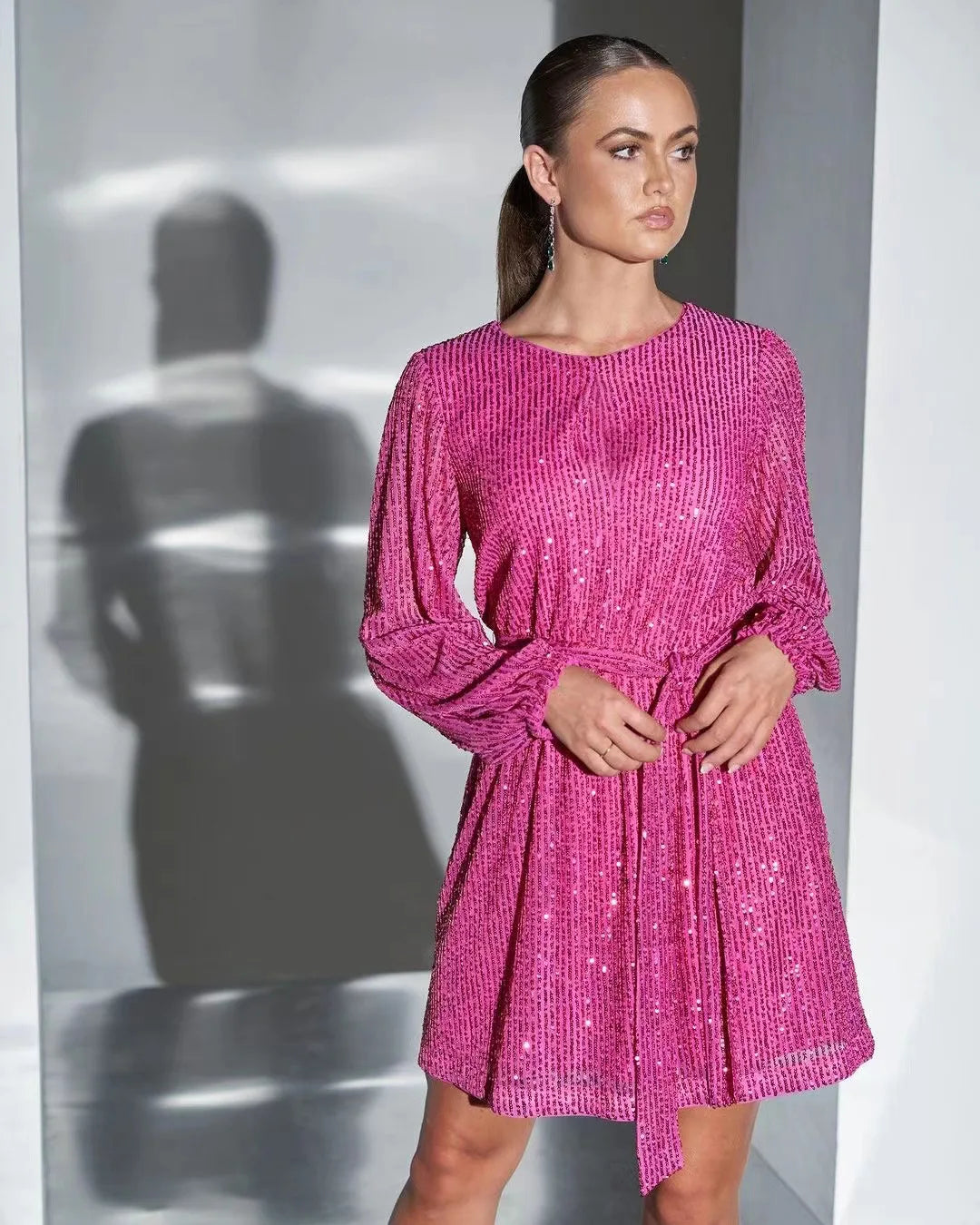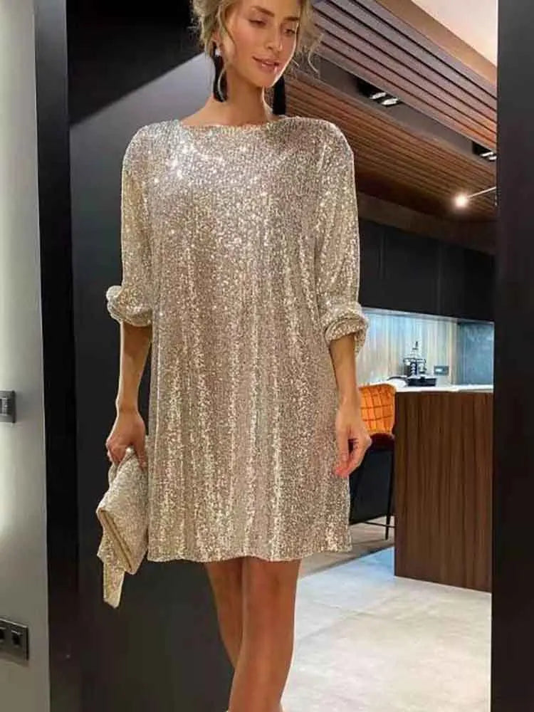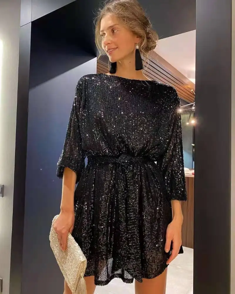 New Party Sequins Mini Dress Women O-neck Lantern Sleeve Dresses Women Casual Loose Lace Robe Femme Red Платье Женское Vestidos