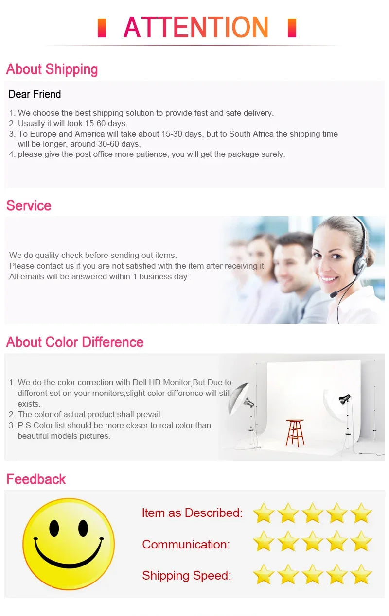 1: Since your feedback is very important for our store. We sincerely invite you to leave all five stars feedback for us, if you are satisfied with our goods and service.