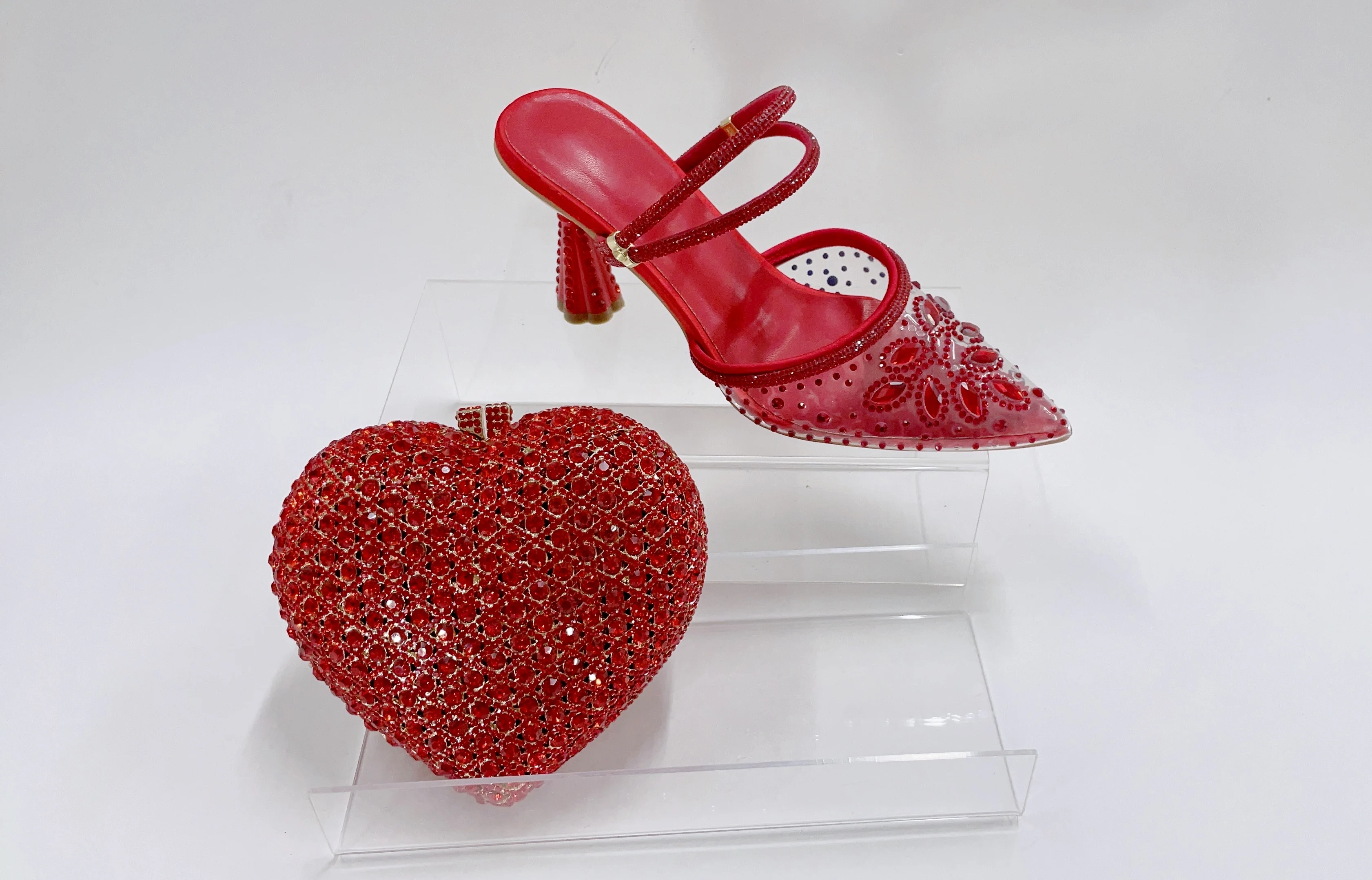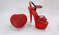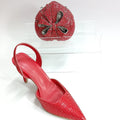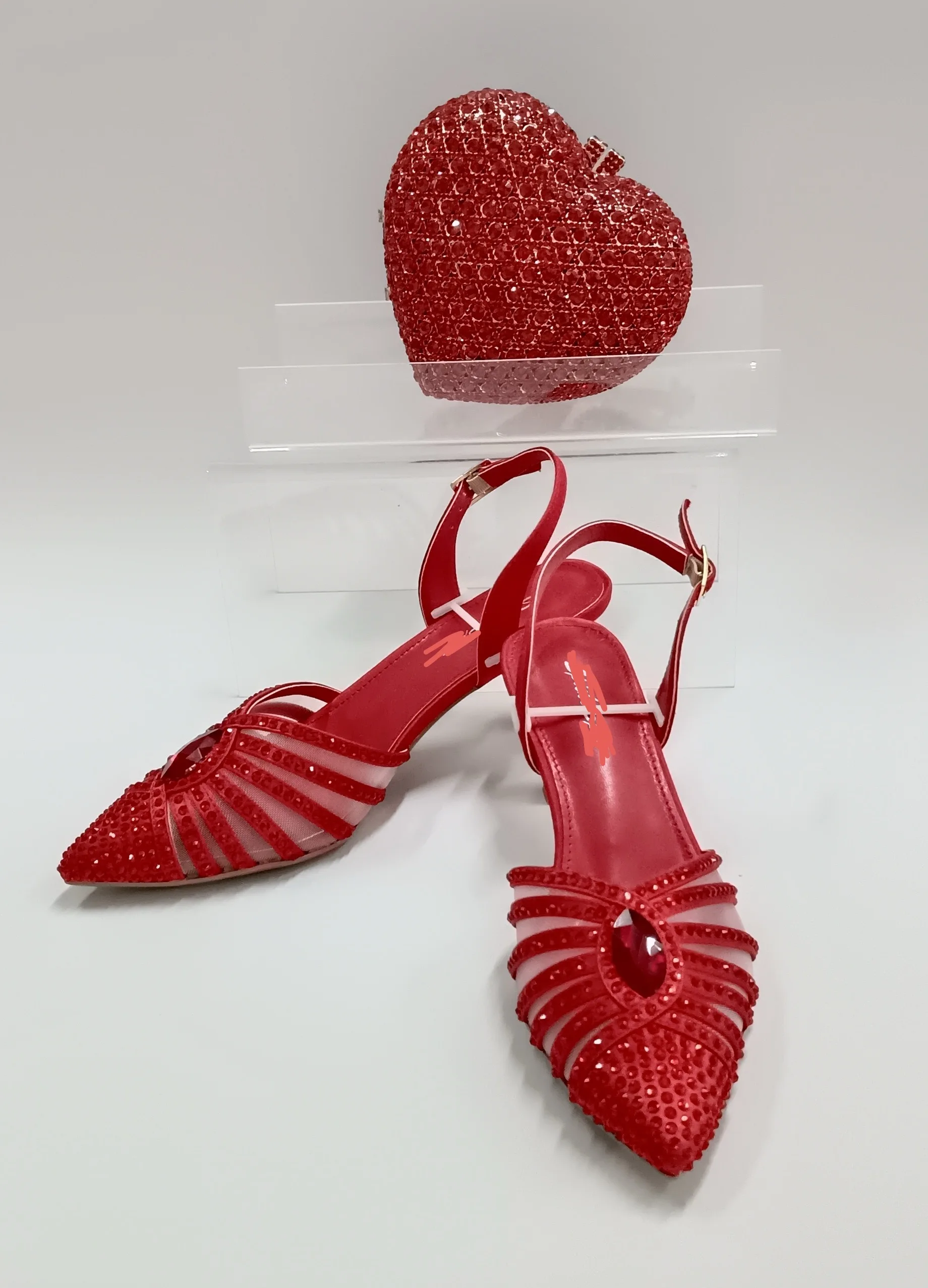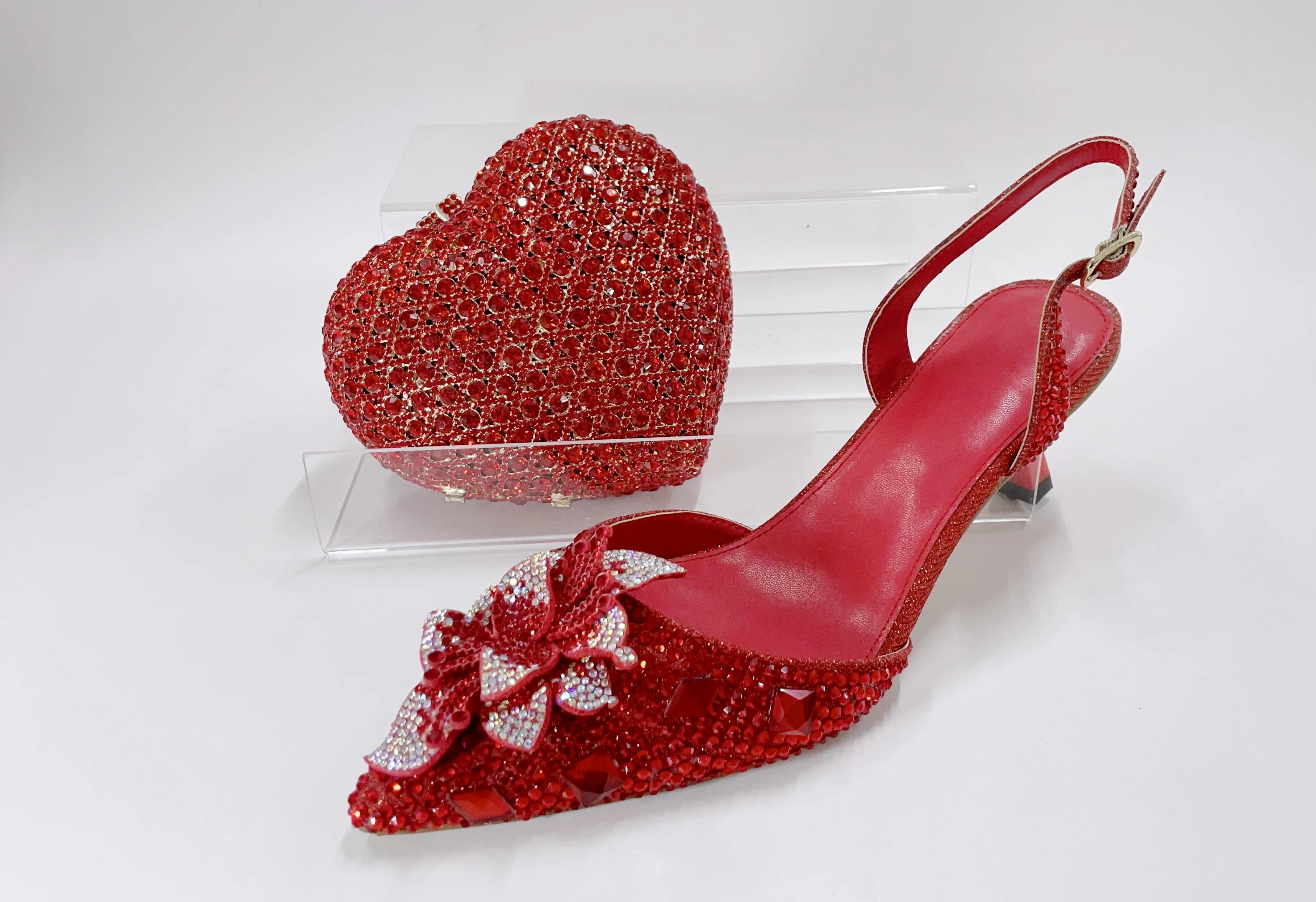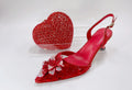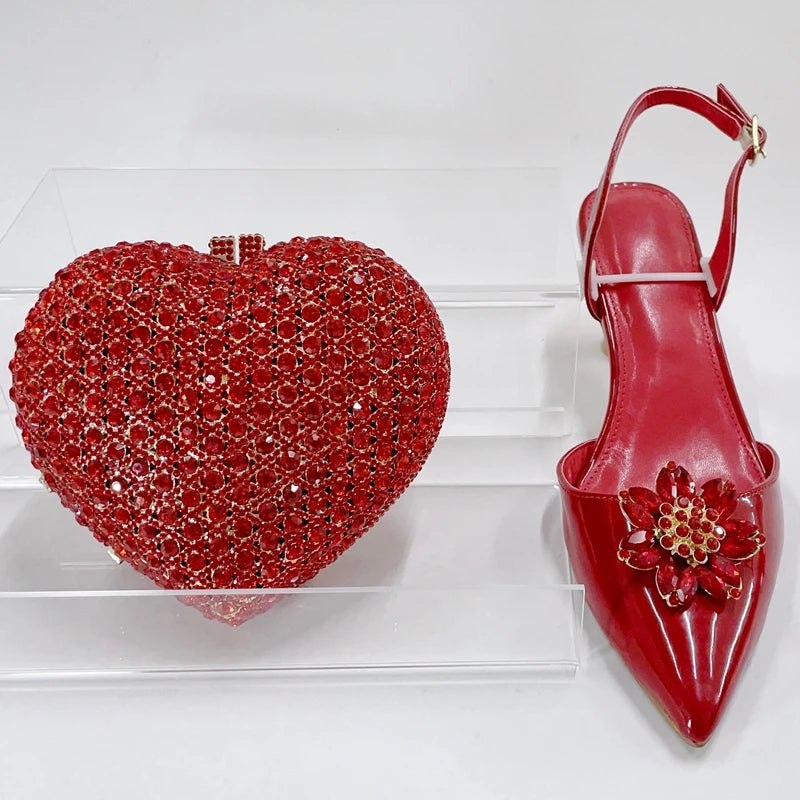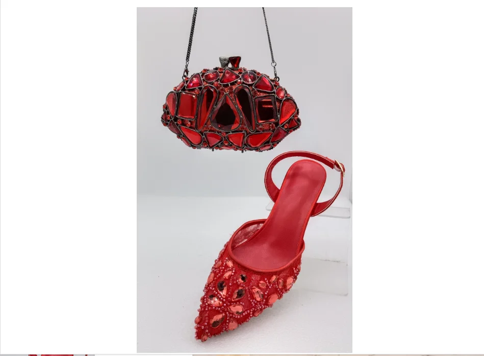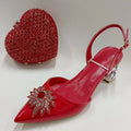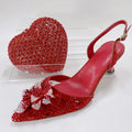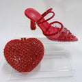 Red Color Party Sandals with Rhinestones Nigerian Women's Medium Heel Pointed Toe Shoes And Bags Set for Women