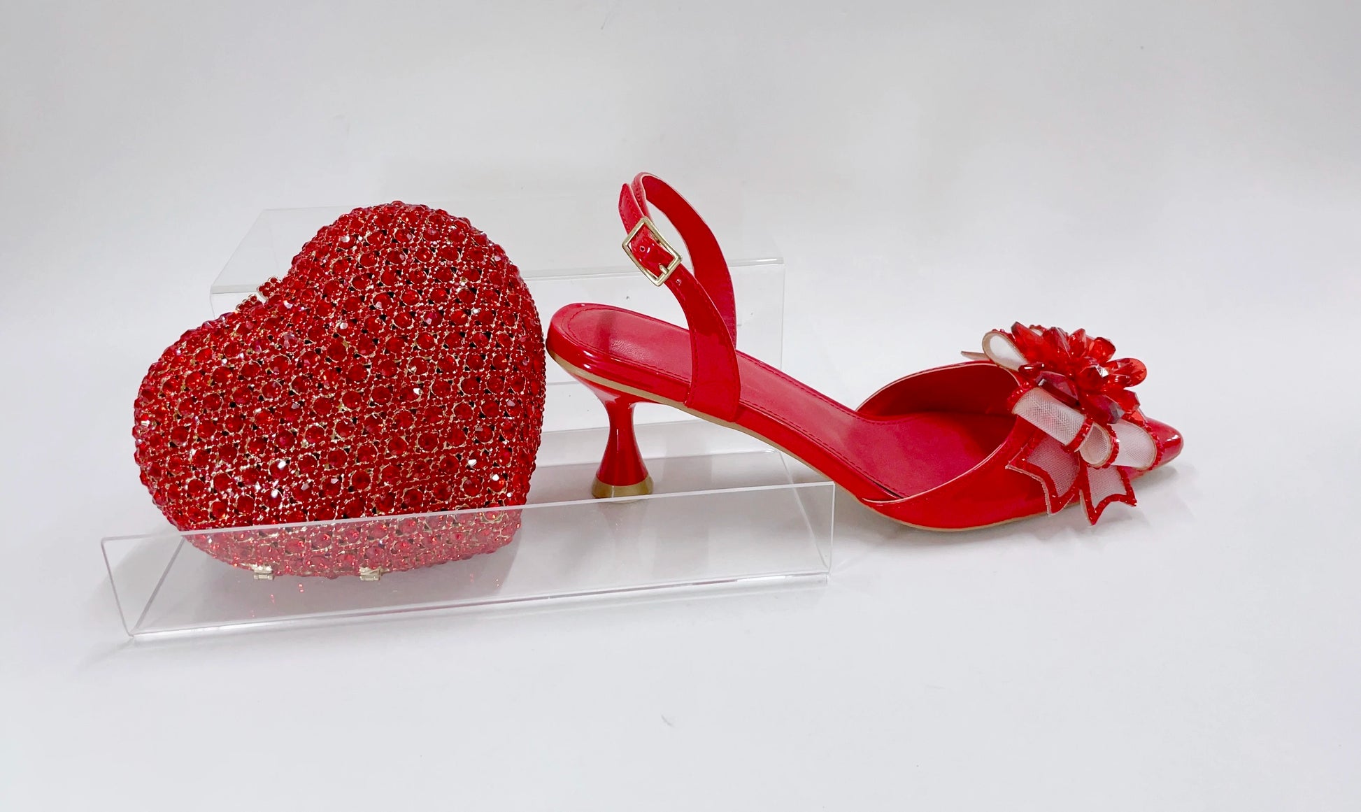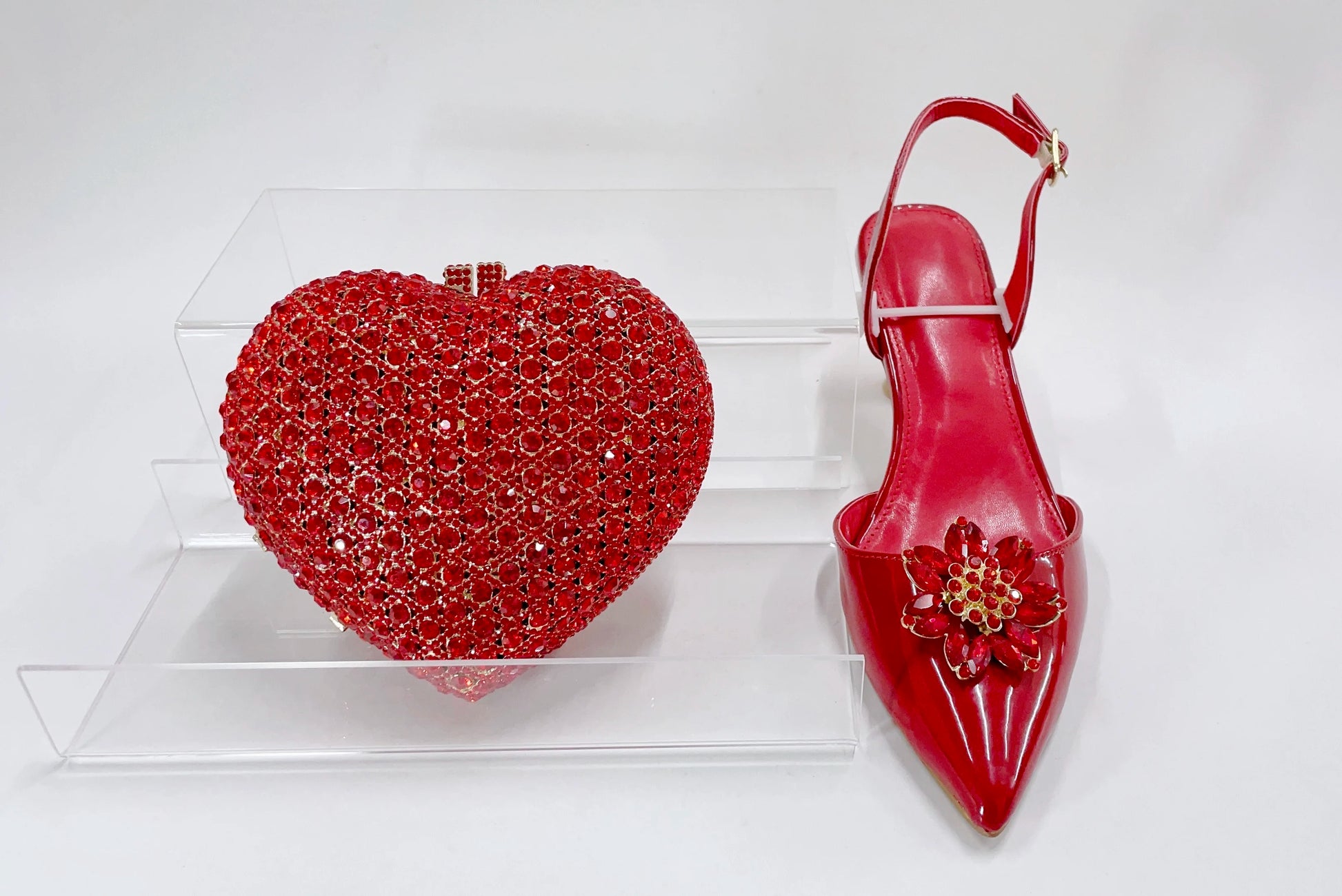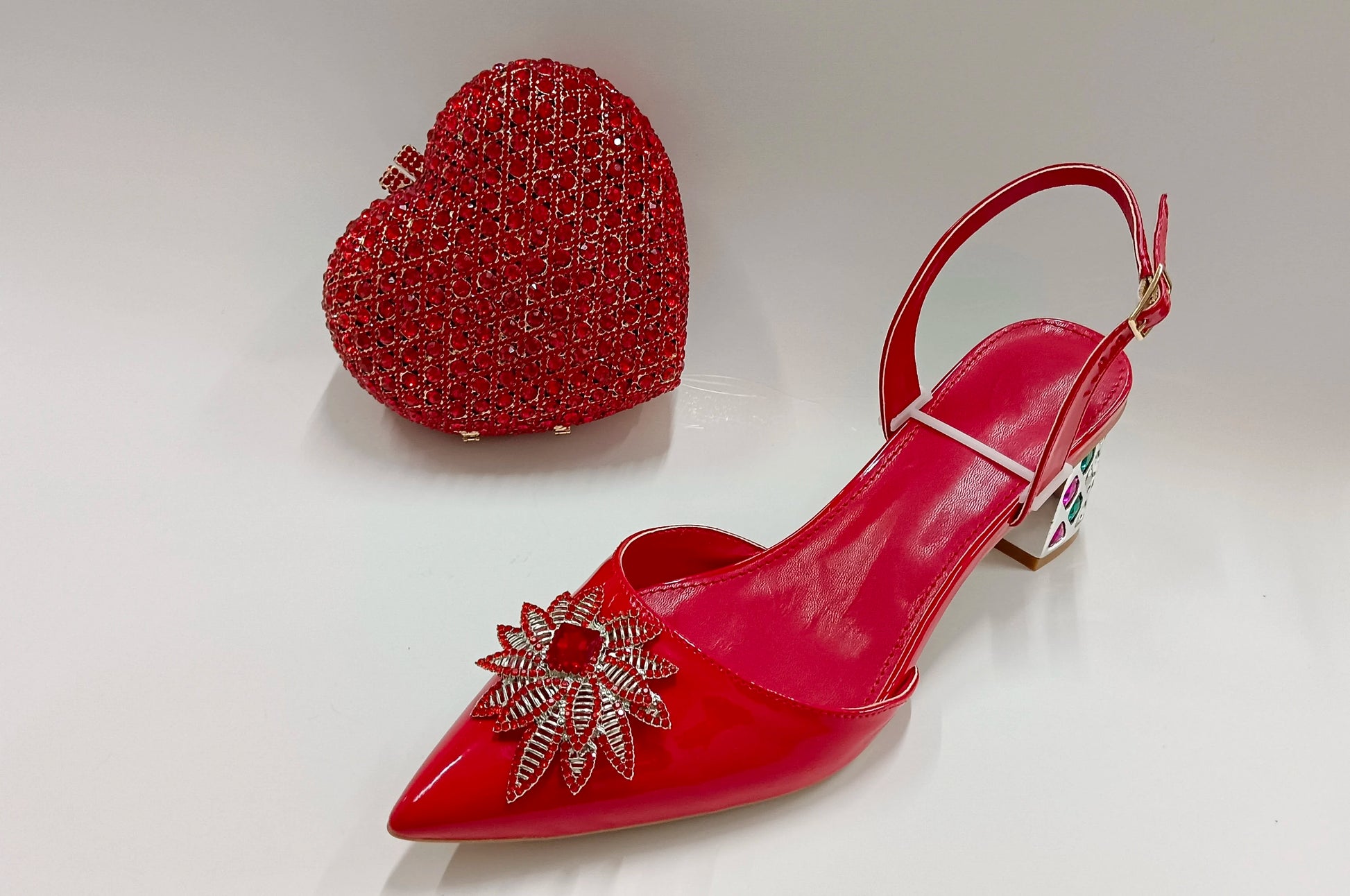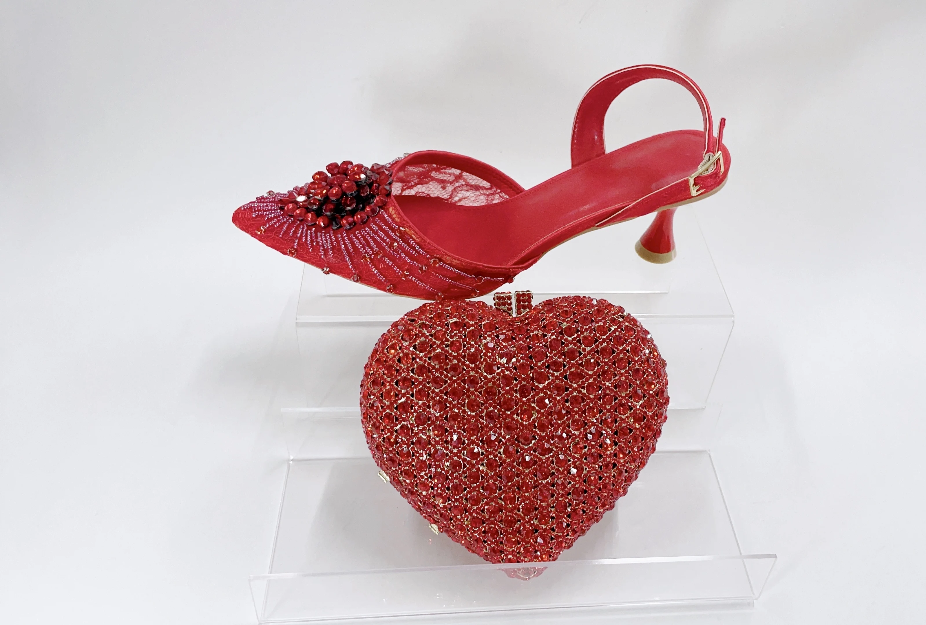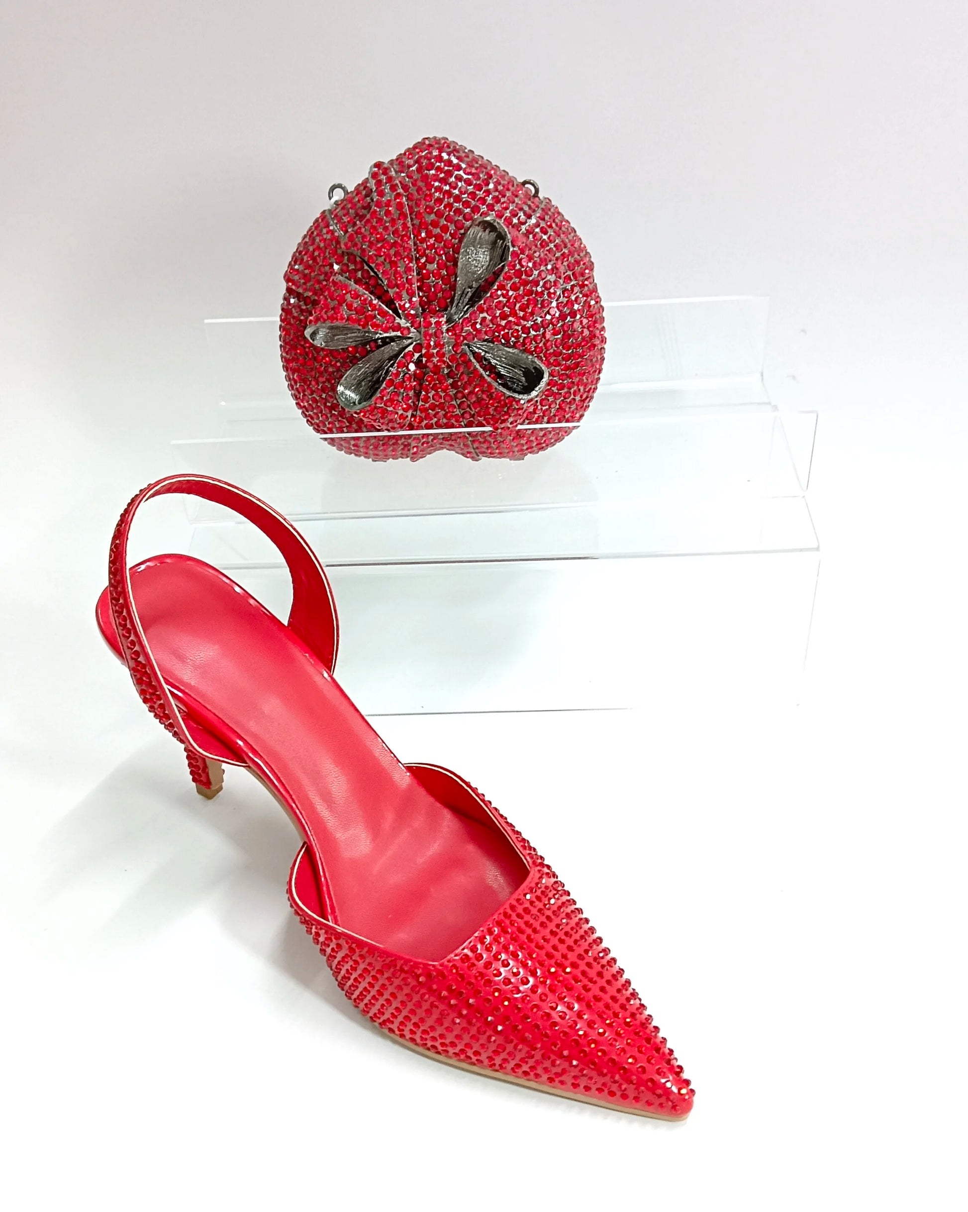 Red Color Party Sandals with Rhinestones Nigerian Women's Medium Heel Pointed Toe Shoes And Bags Set for Women