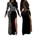 Women Sexy Round Neck Long Sleeve High Slit Sequin Dress
