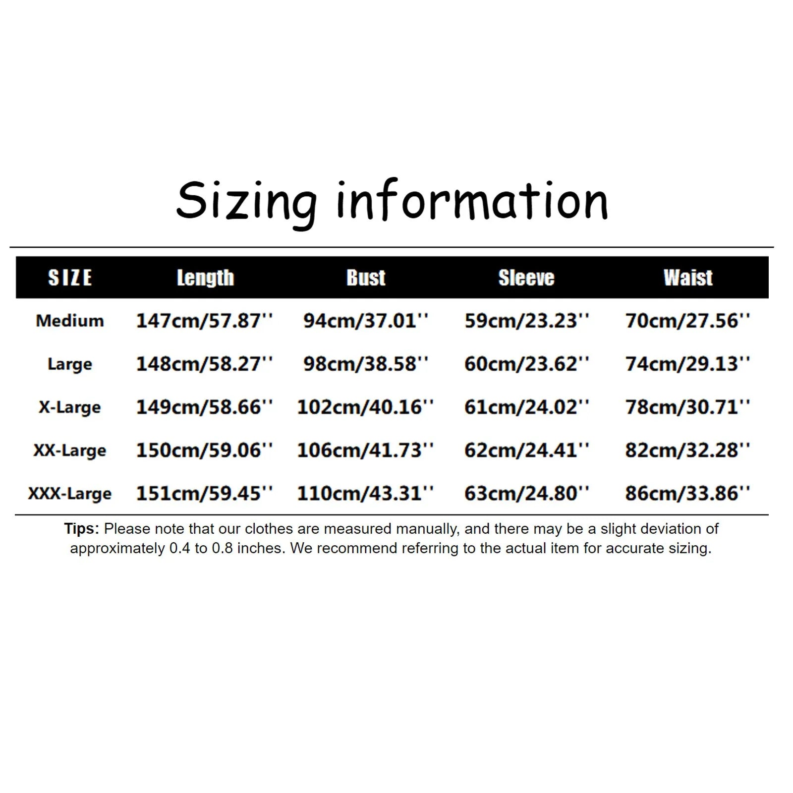 | Size:XXXL | Bust:110cm/43.31'' | Waist:86cm/33.86'' | Sleeve:63cm/24.80'' | Length:151cm/59.45'' |