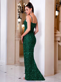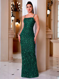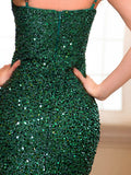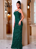 Sleeveless Green Sequined Evening Party Dress Simple Slim Fit Long Gown