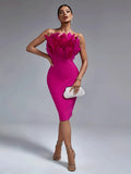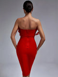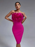 Women’s Red Bandage Feather Bodycon Dress – Strapless Midi Party & Evening Dress