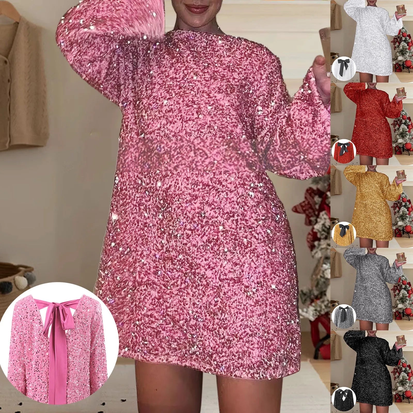 Women's Shiny Sequin Party Dress – Backless Bowknot O-Neck Glitter Evening Gown, Long Sleeve Elegant Vestidos