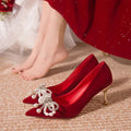 Women's Spring Autumn Block Heel Shoes Chinese Pointed Toe Shallow Mouth Beaded Bow plus Size Comfortable Non-Slip Fashion Pumps